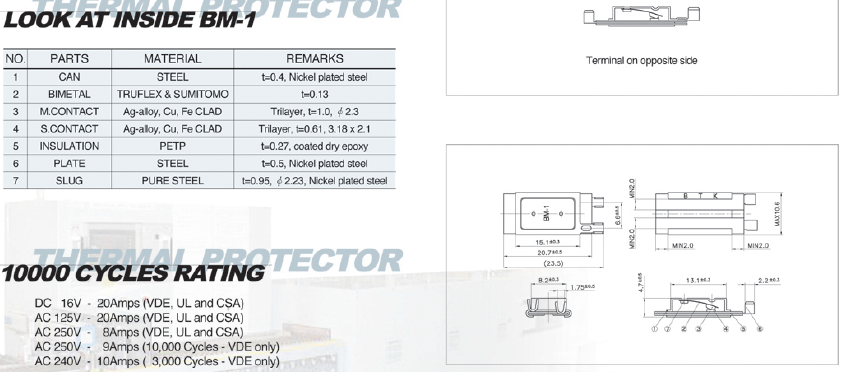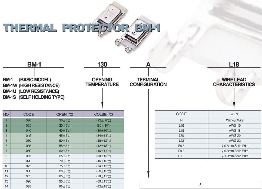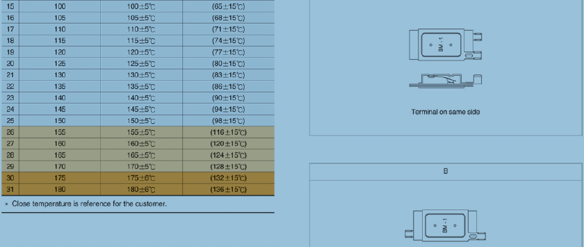 東莞市愛多電子公司長期代理銷售MCS、BTK的BM系列各型號溫控開關(guān),有BM1、BM2、BM3三個系列,BM-1分BM-1W(高阻型號)、BM-1U(低阻型號)、BM-1S(自持式)三類,一般都是使用BM-1S系列。BM2(小體積)分為BM-2W(高阻型號)、BM-2U(低阻型號)、BM-2S(自持式)三種,BM-3系列請來電索取相關(guān)資料。端子型號有同向A跟異向B之分,如型號為:BM-1S-065A就表示為BM-1系列的65℃同向端子,BM-1S-065B就表示為BM-1系列的65℃異向端子溫控器。溫控器溫度控制范圍寬,從最低30℃至最高溫度180℃,每間隔5℃有一款,有高阻跟低阻之分,耐電流高,更多介紹請電聯(lián)。