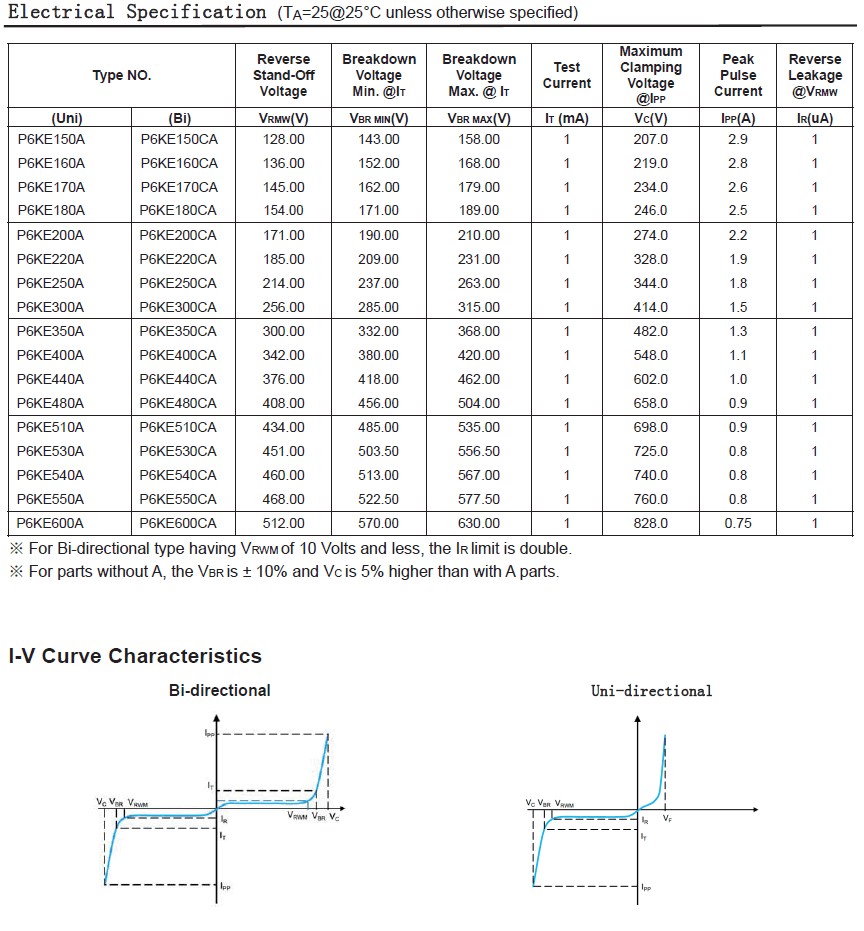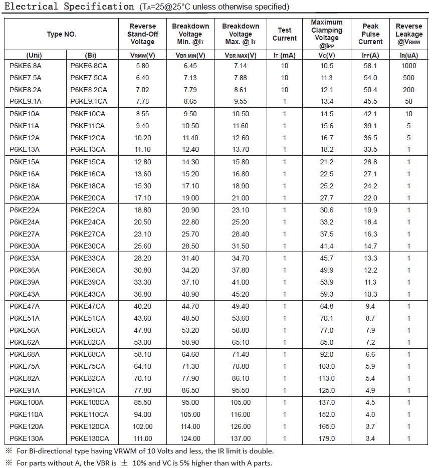 TVS二極管總型號P6KE,電壓從6.8V至600V。P6KE6.8—P6KE600CA