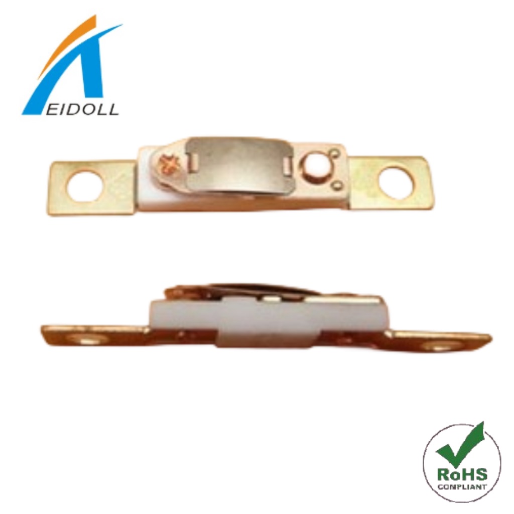 采用高靈敏雙金屬元件、彈片、動觸頭、靜觸頭、陶瓷基座、等組成。工作時雙金屬元件處于自由狀態,動觸頭與靜觸頭處于閉合狀態。當使用電器因故障發熱,溫度上升到該產品額定動作溫度值時,雙金屬元件受熱產生內應力而迅速動作推開動觸頭,使觸點斷開切斷電源,電器停止工作,從而起到過熱保護作用。當被保護電器溫度下降到該產品的額定復位溫度值時,雙金屬元件恢復到初始狀態觸點閉合,電器恢復工作。