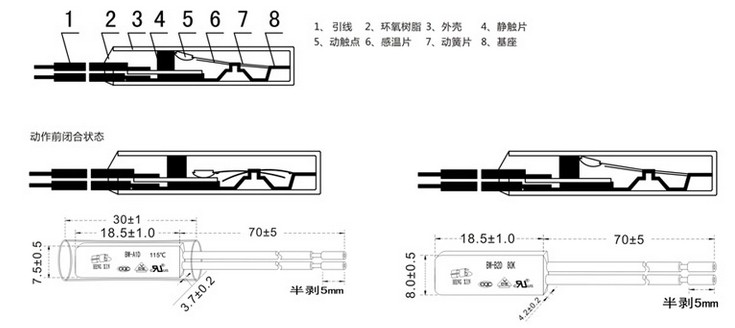 BW型溫度保護(hù)器是由碟形高靈敏雙金屬元件、動(dòng)觸頭、靜觸片、固定底版、外殼和耐溫導(dǎo)線等組成。工作時(shí)雙金屬元件處于自由狀態(tài),動(dòng)觸頭與靜片閉合,電路導(dǎo)通。當(dāng)使用電器因故發(fā)熱,溫度上升到該產(chǎn)品額定動(dòng)作溫度值時(shí),雙金屬元件受熱產(chǎn)生內(nèi)應(yīng)力而迅速動(dòng)作,推開動(dòng)觸頭,使觸點(diǎn)斷開,切斷電源,電器停止工作,從而起到過熱保護(hù)作用。當(dāng)被保護(hù)電器溫度下降到該產(chǎn)品的額定復(fù)位溫度值時(shí),雙金屬元件恢復(fù)到初如原狀態(tài)動(dòng)觸點(diǎn)閉合,電器恢復(fù)工作。該產(chǎn)品具有電阻小、感溫快、動(dòng)作迅速、安全可靠、體積小等優(yōu)點(diǎn)。
