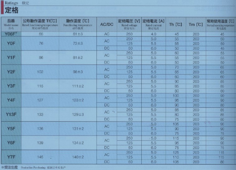 4)Y-F系列,AC250V 4.0-5.0A,AC125V 5.5-6.0A.具體型號如下:
