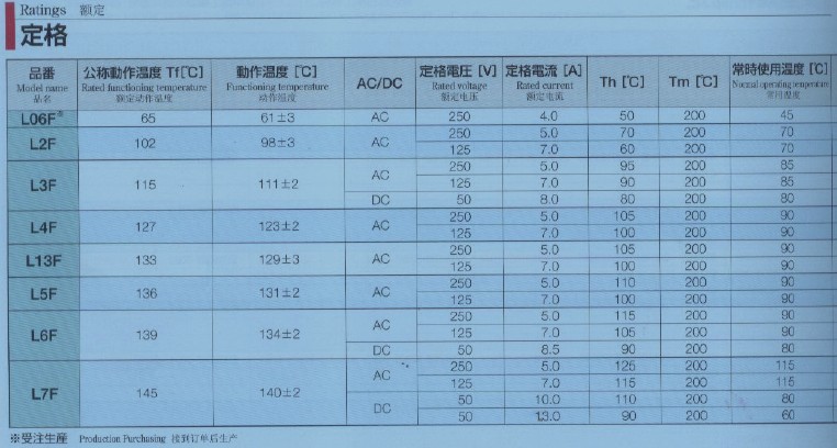 5)L-F系列,AC250V 4.0-5.0A/AC125V 7.0A,具體型號如下: