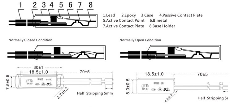 BW series temperature protector consists of round shape high sensitive bimetallic element, movable contact-head, static contact-piece, soleplate, outer case, thermal resistant lead and so on. When operation, the bimetal element is in free stage and movable contact head and static contact-piece are closed and the circuit is on. When the electric appliance is in operation and produce heat cause by some trouble and temperature is raise to the rated action temperature of the product. The bimetal element produce inner stress and act quickly and push the movable contact-head and make the contact point off and the power supply is turn off and the electric appliance stop. In this way the thermal protection is made. When the temperature of electric appliance to be protected is drop to the rated reset temperature, the bimetal element will restore to its primary stage and contact point is closed. The product has many advantages such as small is resister, quick response in temperature, and in action, safe and reliable, compact in size, etc.